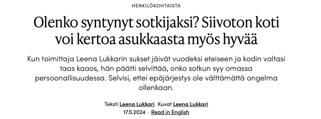 3. Kotivinkki-lehti ja Meillä Kotona-portaali julkaisi toukokuussa -24 tämän seuraavan jutun ”Olenko syntynyt sotkijaksi? Siivoton koti voi kertoa asukkaasta myös hyvää”: