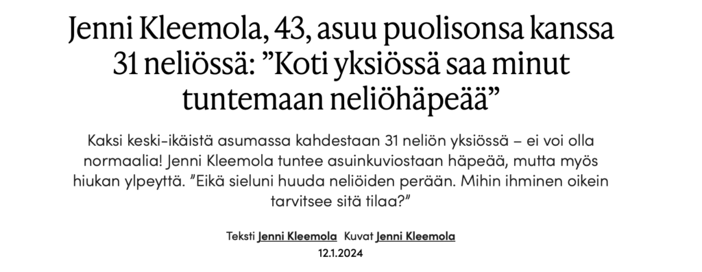 1. Kotivinkin 1/24 artikkeli julkaistiin lehdessä sekä Meillä kotona-portaalissa TÄÄLLÄ. Toimittaja Jenni Kleemola käsittelee jutussa kokemaansa häpeää pienestä kodista: