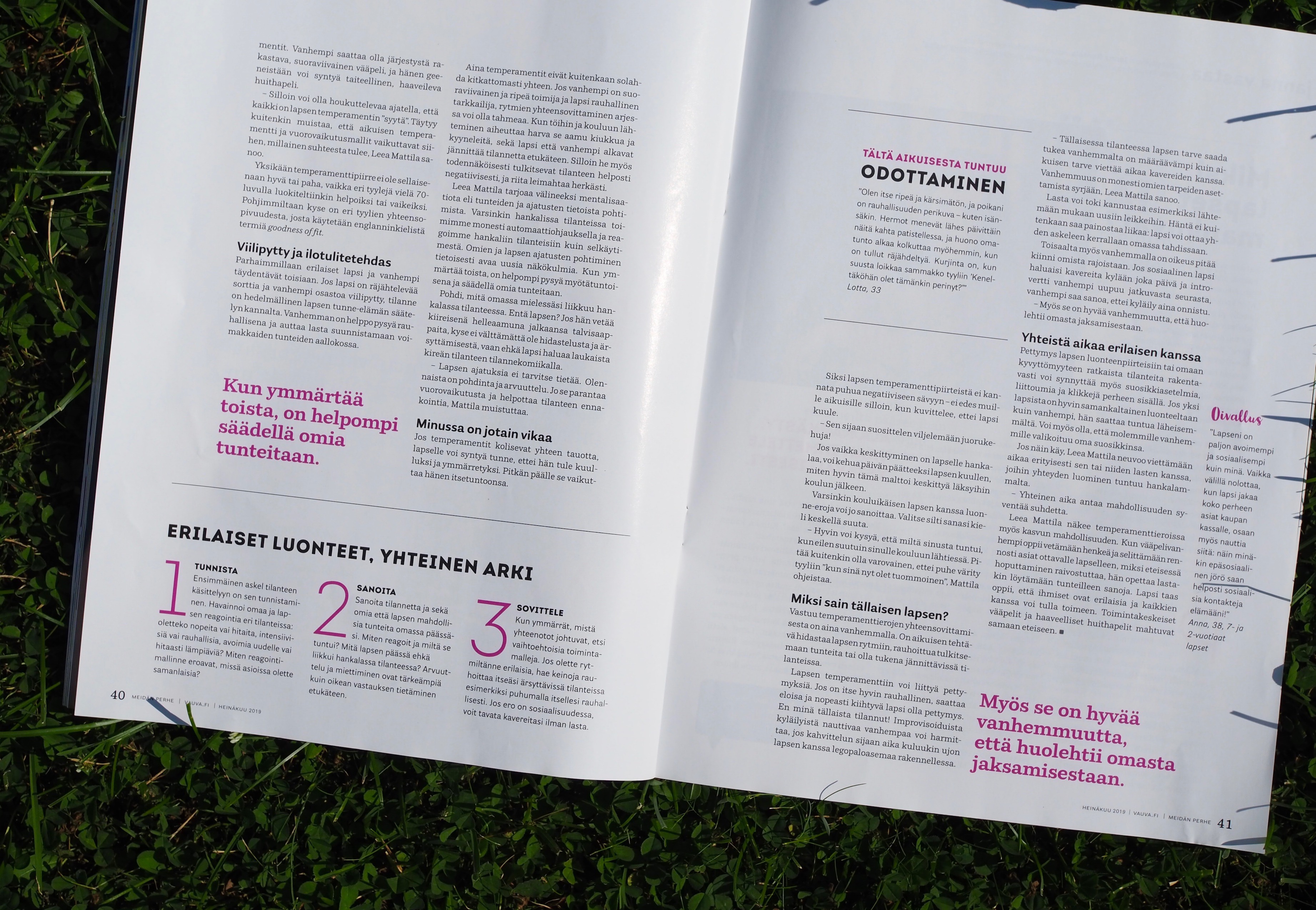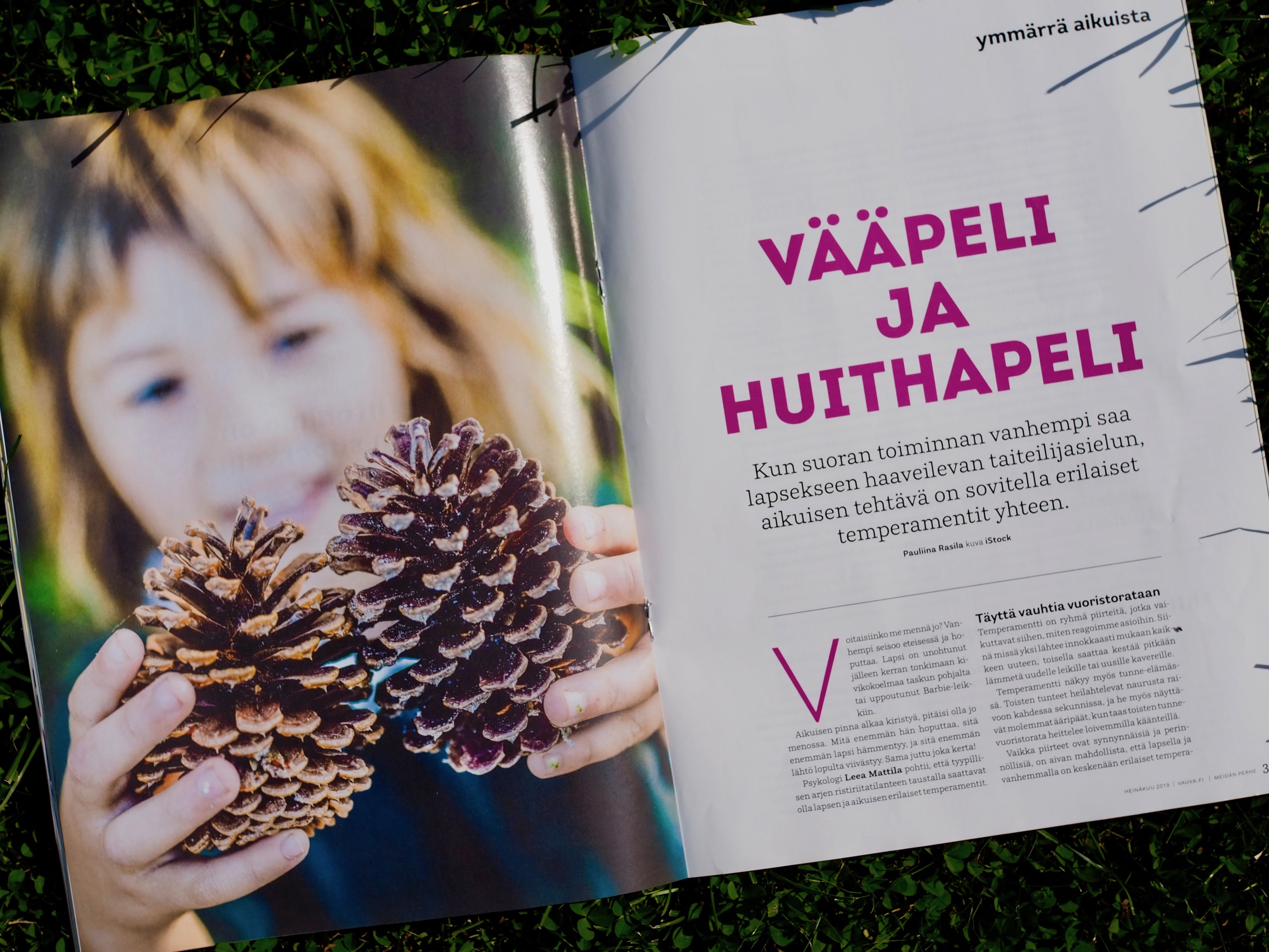 Heinäkuun -19 Meidän Perhe-lehdessä ruodittiin lapsen ja vanhemman temperamenttieroja ja niiden vaikutusta lapsi-vanhempisuhteeseen. Pauliina Rasila kirjoitti aiheesta mukavan ja kannustavan jutun haastatteluni perusteella.